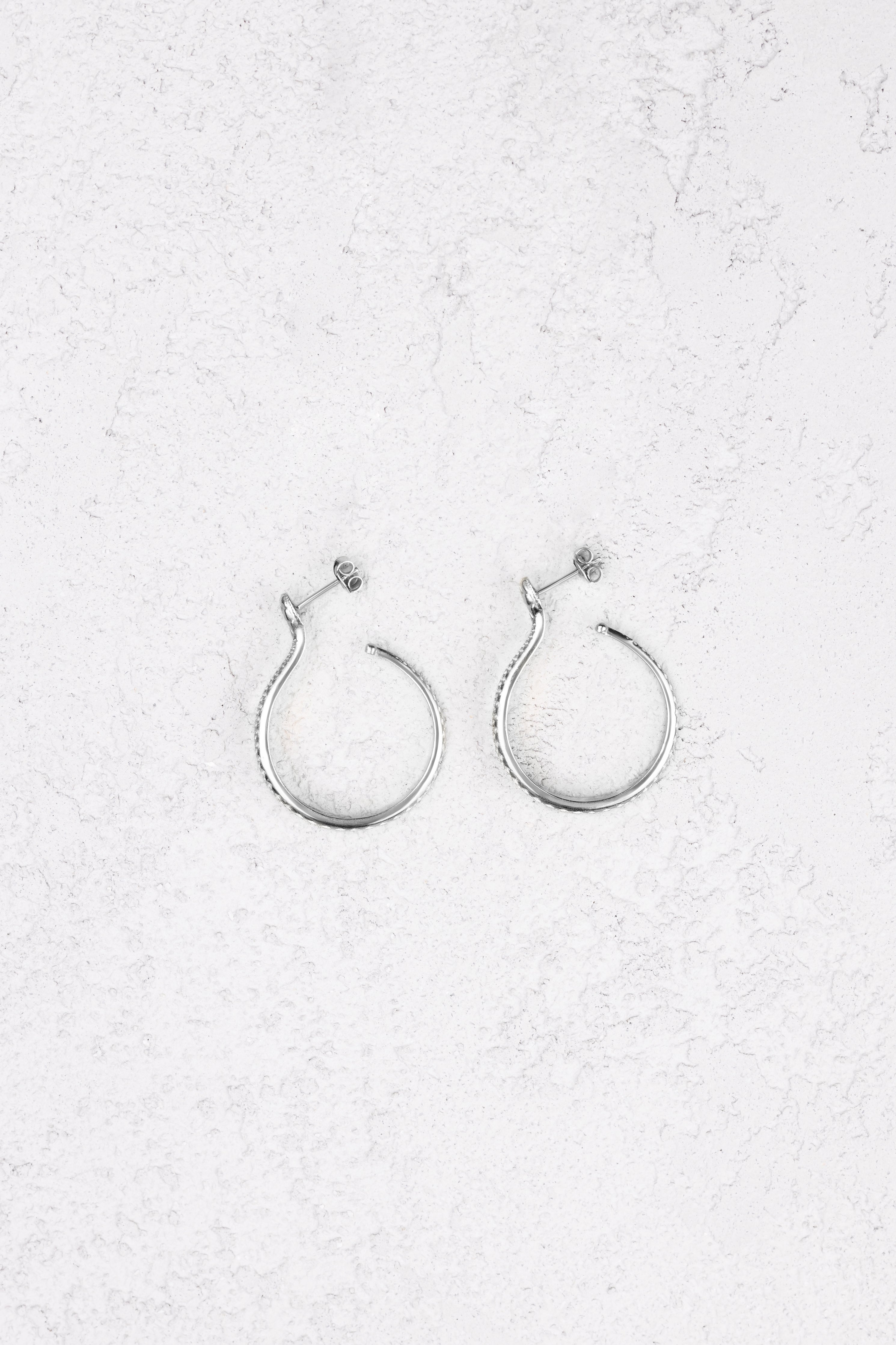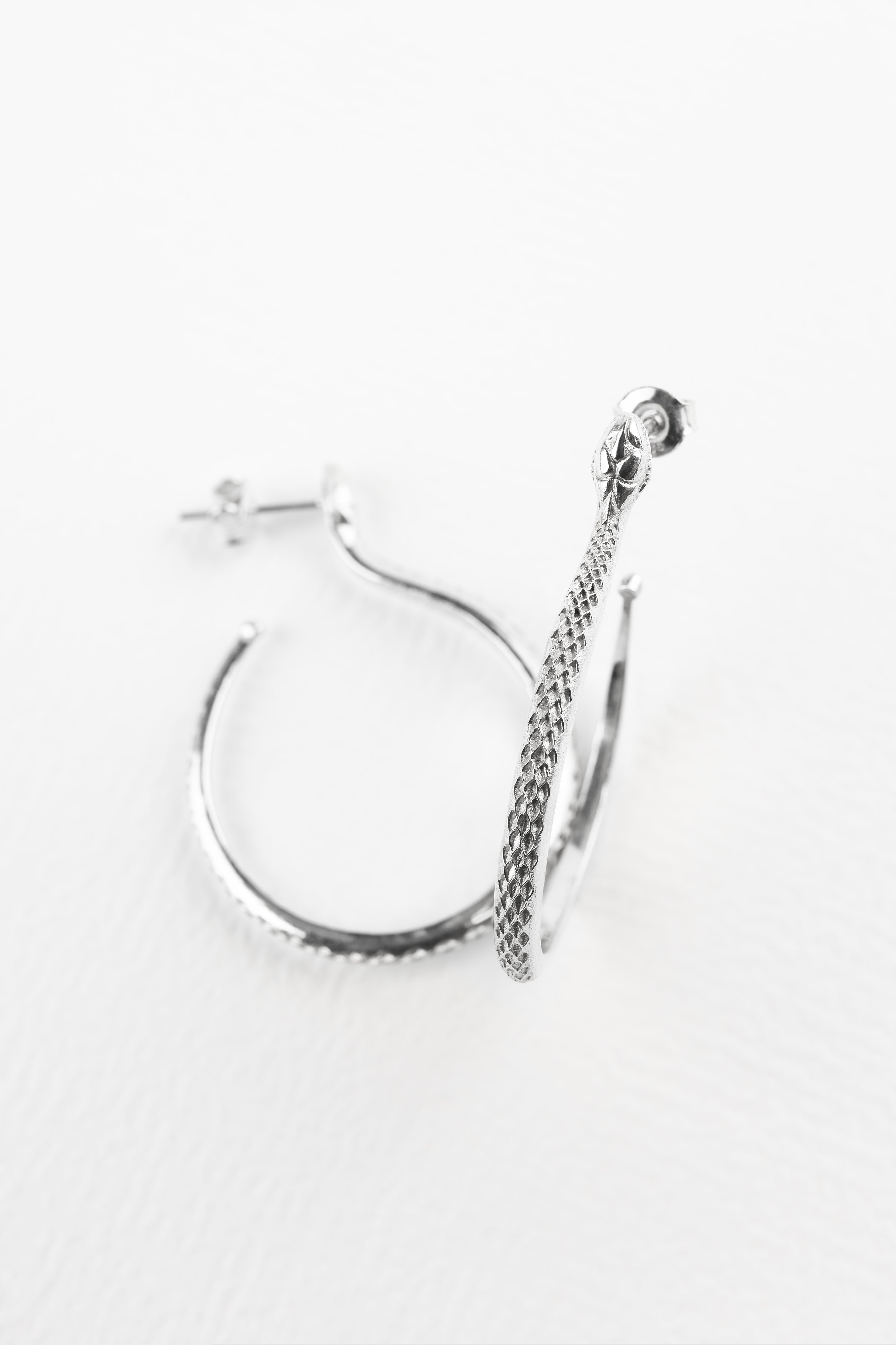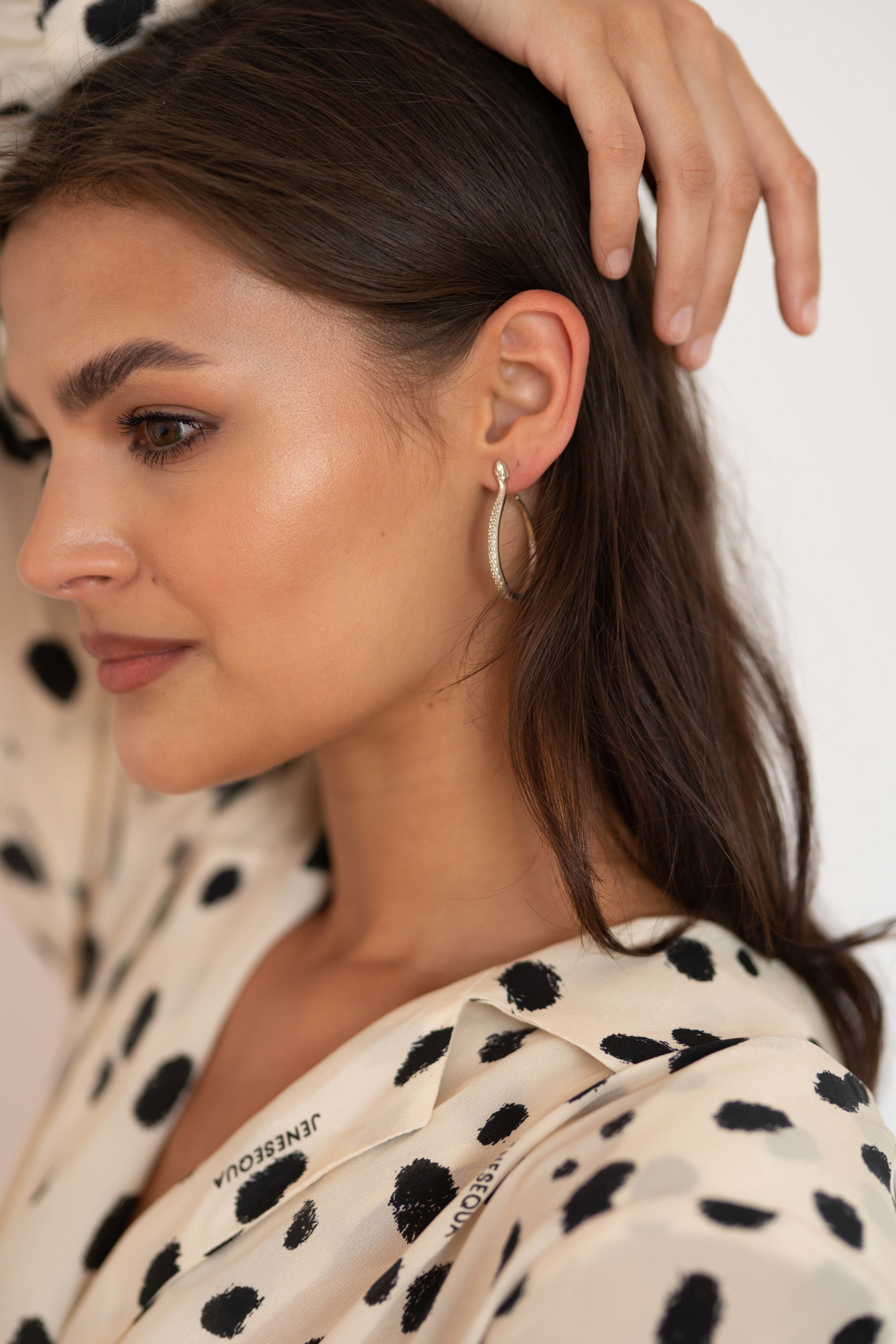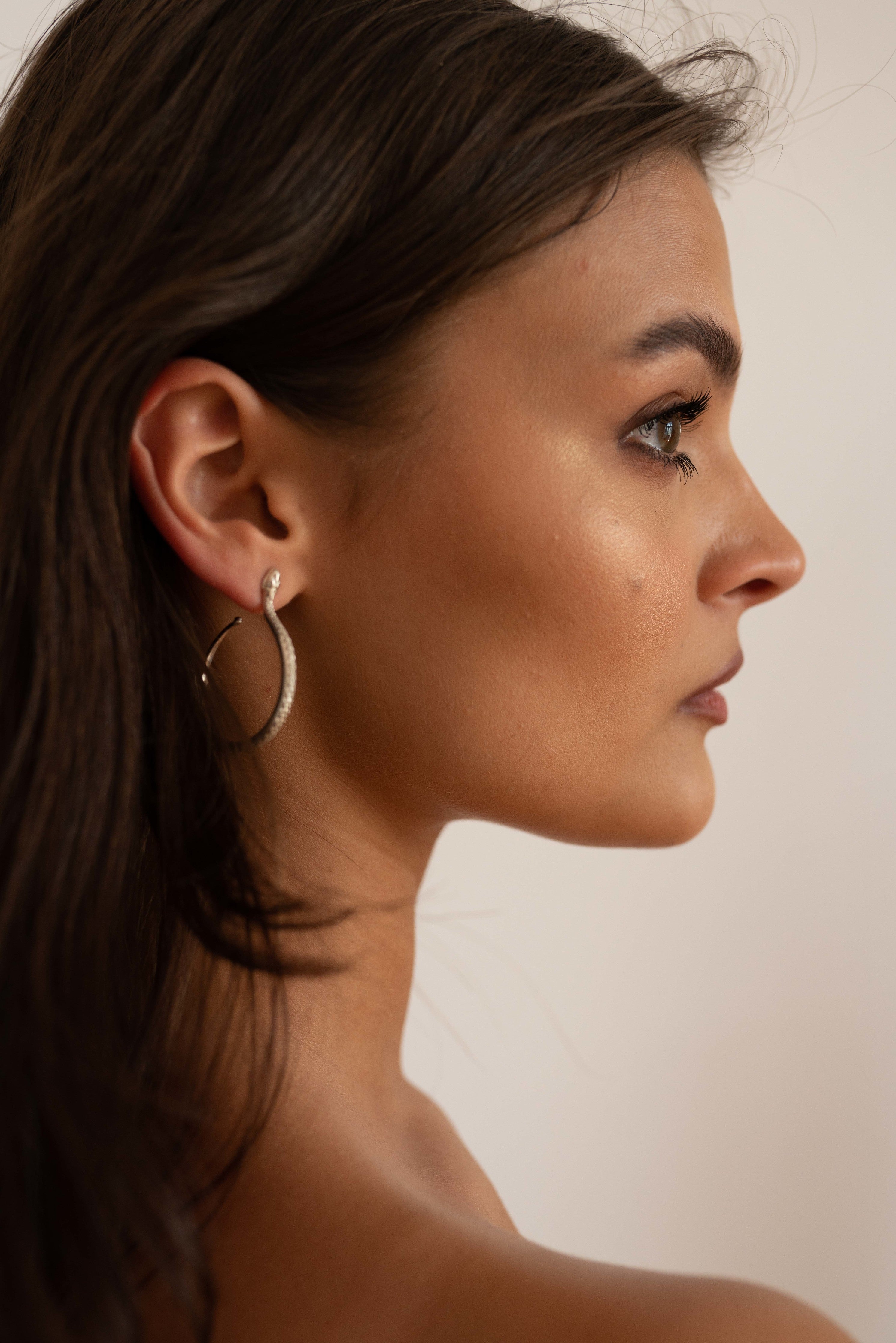 The Sarpe Hoop Earrings are a timeless staple inspired by the silhouette of the snake. The snake is one of the oldest and most widespread mythological symbols. Throughout centuries it has been associated with fertility or a creative life force symbolizing rebirth, transformation, immortality, and healing as well as the dual expressionof good and evil.