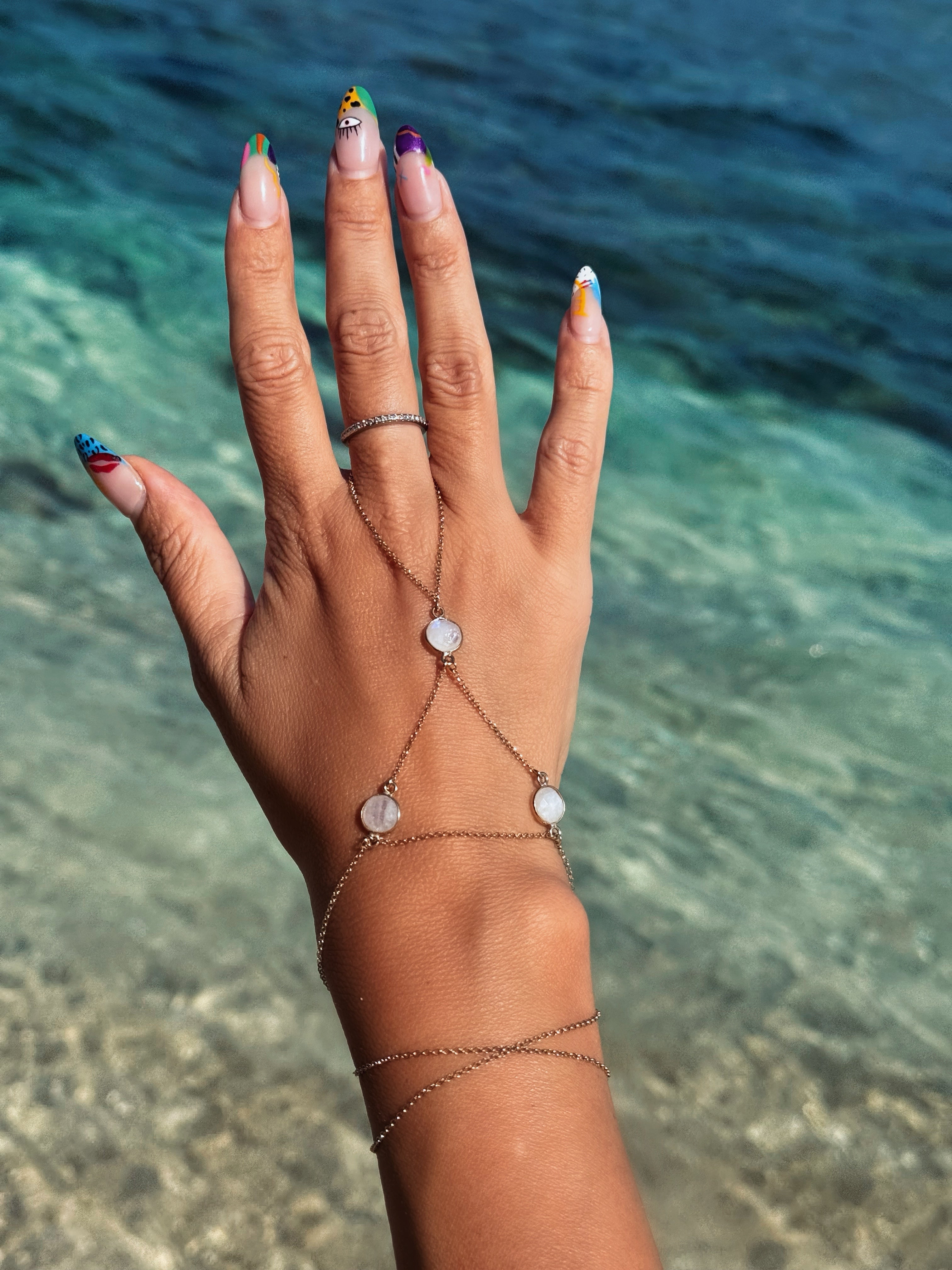 The Zaya Hand Chain (Mongolian: destiny, energy of life) is a handcrafted piece in 925 sterling silver or 24k gold-plated silver, adorned with three natural gemstones arranged in a triangle formation.