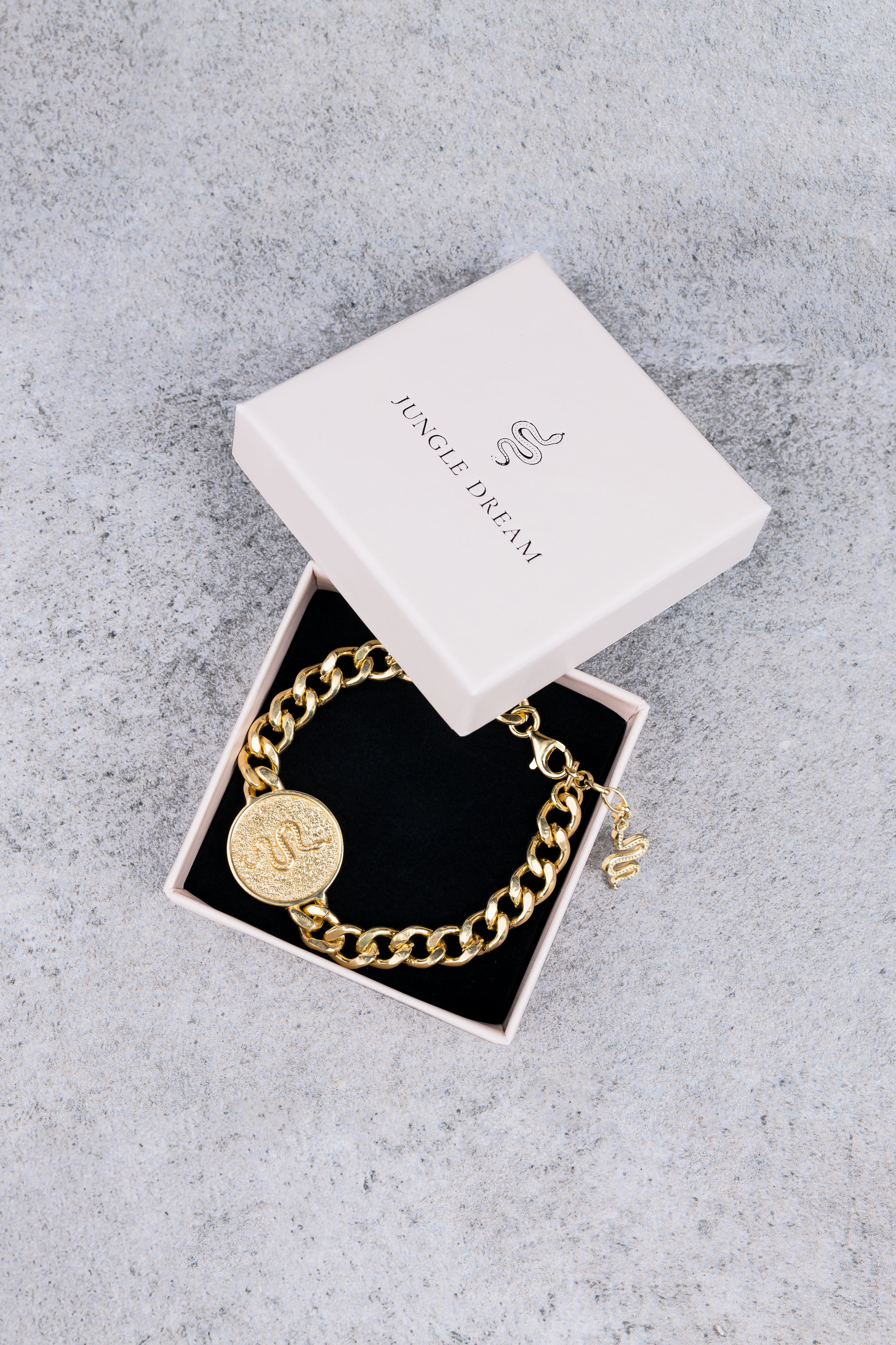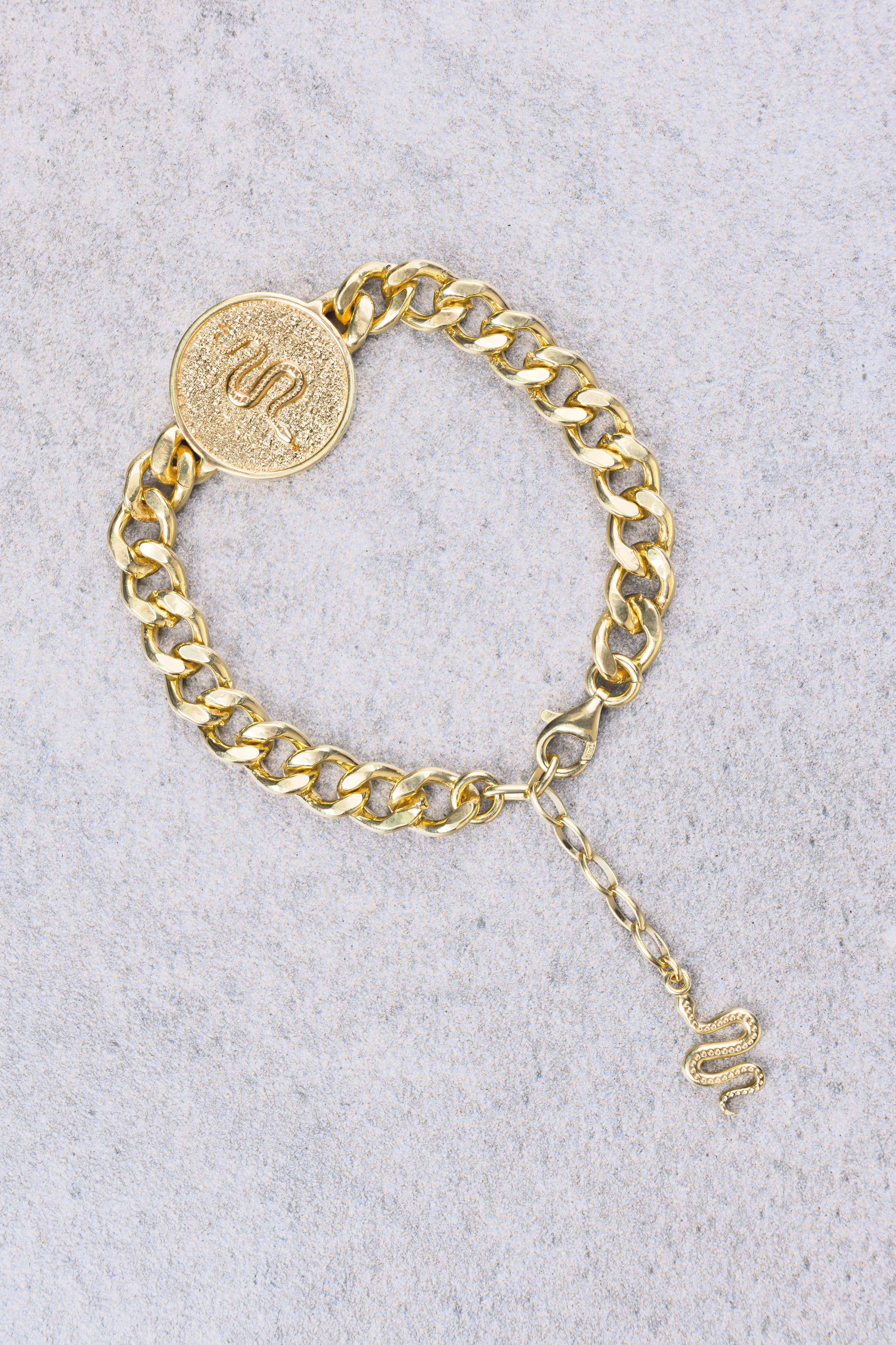 The bracelet everyone has been waiting for! Thick chain, serpent medallion and a small snake detail dangling at the end of the extension chain - this piece was made to draw attention! Match it up with our bestselling Oray choker and Sanjati necklace to create a unified look or layer it with our other bracelets if you love abundance!