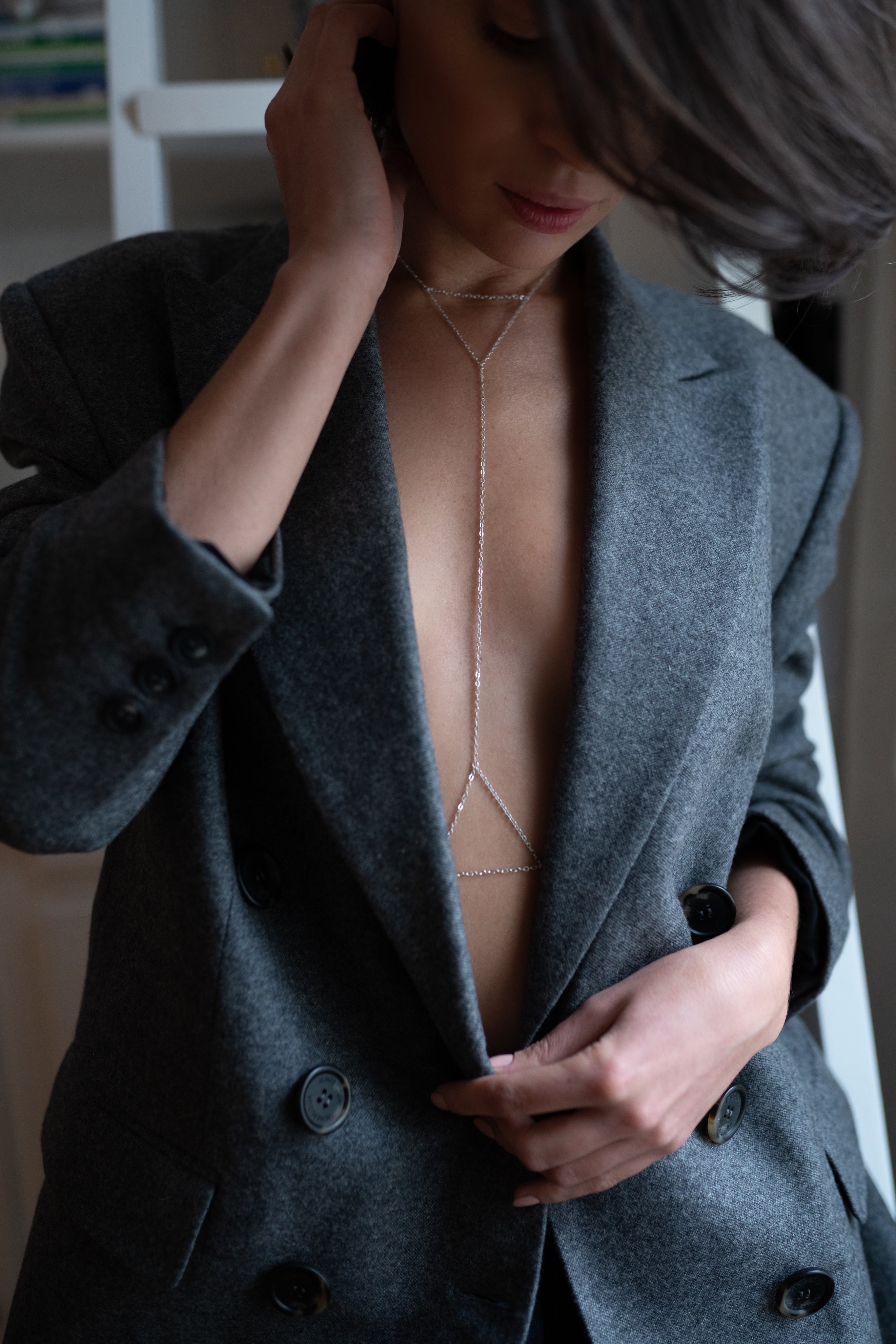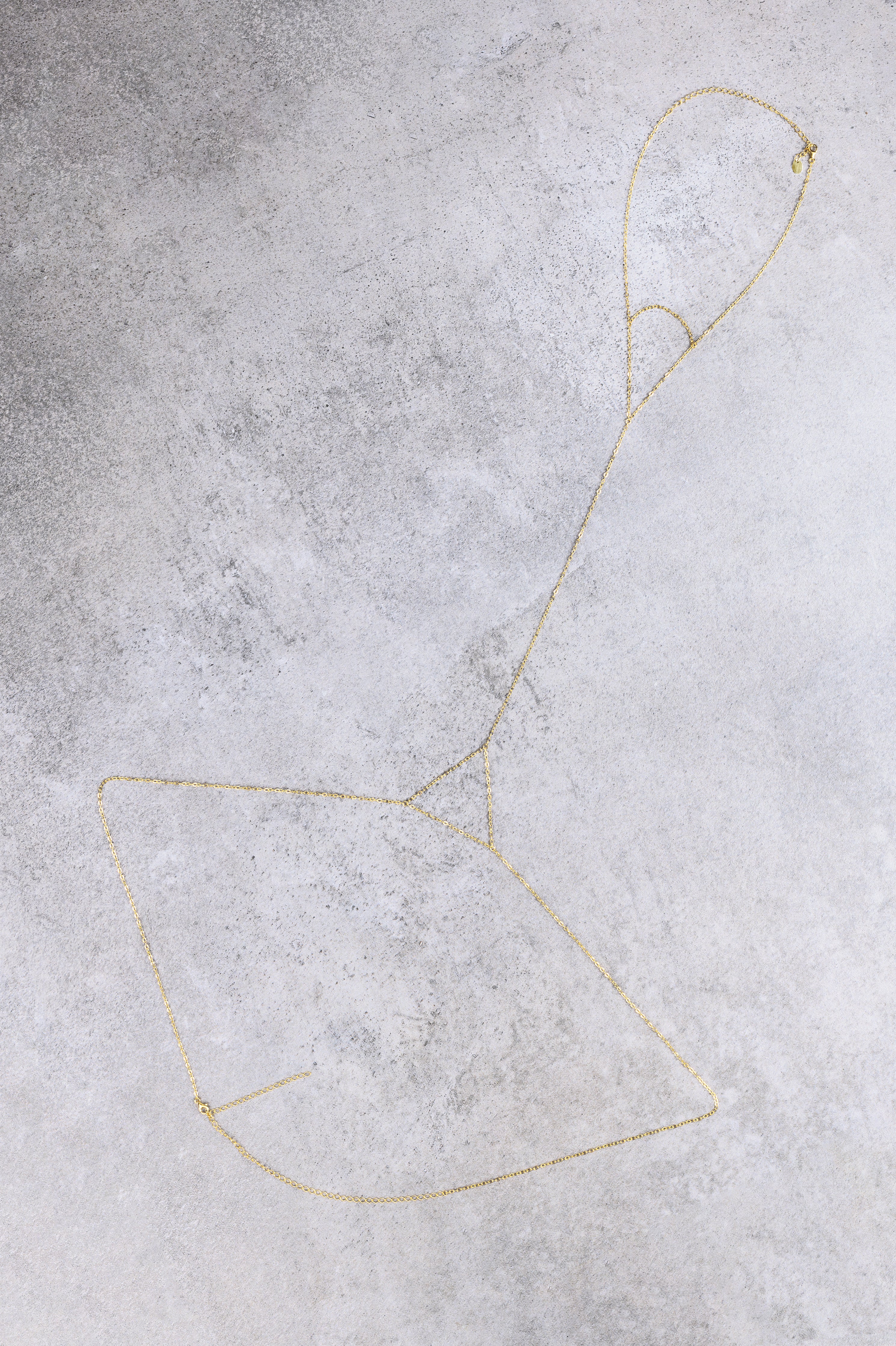 Minimalistic and exquisite, the Sanje body chain is a timeless piece, suiting any outfit and occasion. The delicate chain loops around the waist and the neck, in a choker-like form. Its geometrical shape makes it ever more striking, adding a special touch to anything you wear it with.